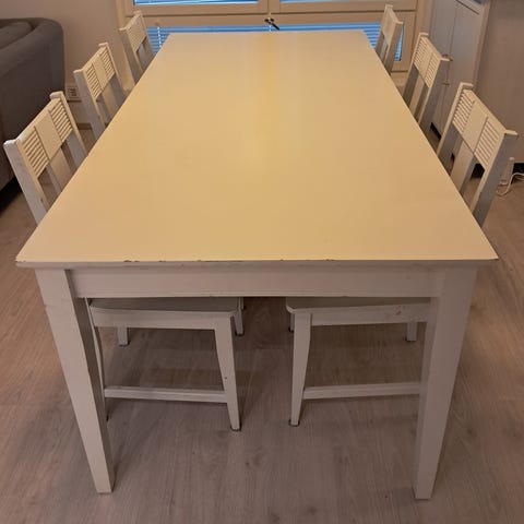 Tuoleissa aikalailla kulumaa ja yksi vähä hajoamassa (katso kuva) mutta varmasti vaan paria kopautusta ja liimaa vaille käyttökuntonen.