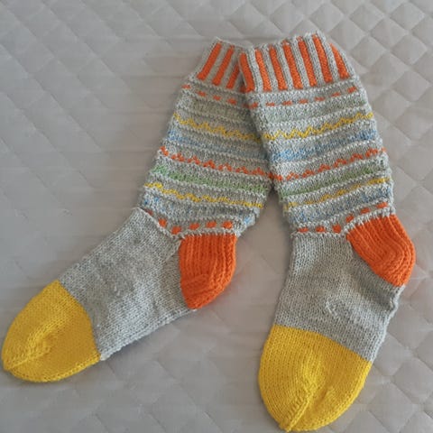 Käsin neulonut villasukat. Koko 38/39. Sukan pituus venyttämättä noin 25 cm. Varsi hieman perinteistä matalampi, noin 8 cm.