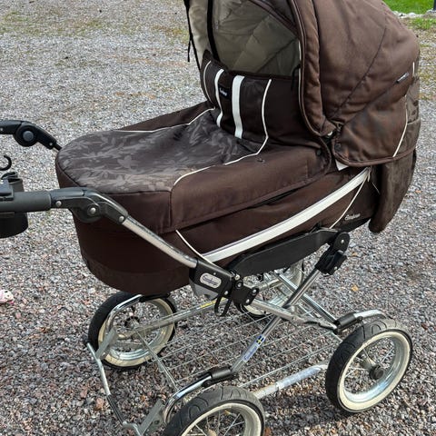 Emmaljunga vaunut harmaalla värillä. Vaunut on varustettu irrotettavalla kantokopalla, säädettävällä työntöaisalla ja tilavalla säilykorilla. Materiaali on kestävää kangasta. Mukana Emmaljungan mukiteline(uusi),sadesuoja ja aurinko/hyttyssuoja.