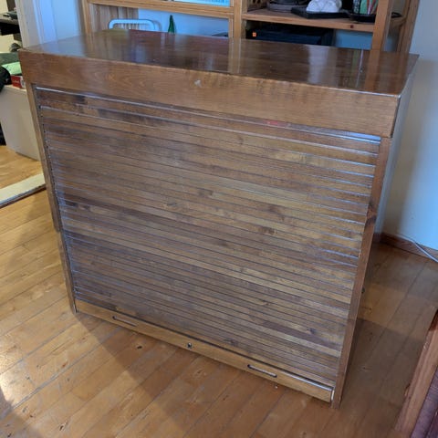 Kuvissa kahteen osaan purettuna. Kyseessä kaappi, jonka alaosassa rulokaappi ja yläosassa kirjahylly. Avainta ei ole. Rulomekanismi toimii. Nouto Vesilahdesta.