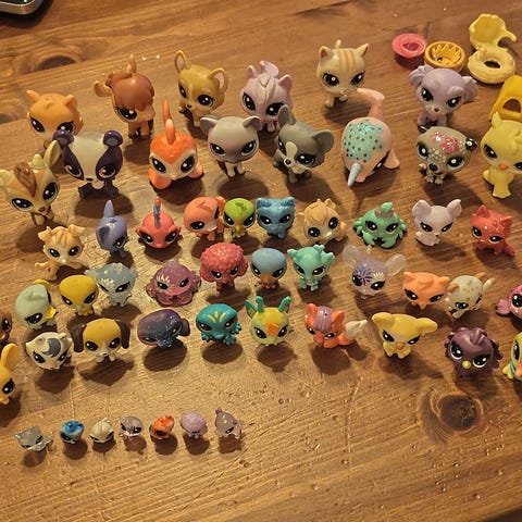 Paljon erilaisia ja eri ikäisiä littlest pet shop figuureita. Auto, pieni talo ja muita juttuja.