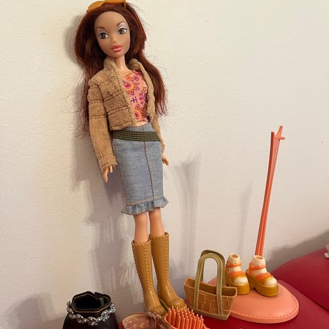 Kuvien mukaisessa kunnossa olevat Britney Spears Baby one more time nukke ja nukelle kuuluvat tavarat vuodelta 1999.