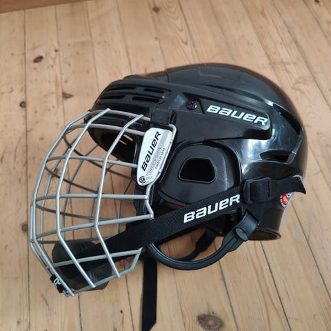 Vanha mutta asiansa vielä ajava Bauer jääkiekkokypärä, musta väri, varustettu metallisella ristikolla kasvojen suojaamiseksi. Koko muistaakseni small