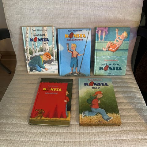 Tuula Kallioniemen kirjoittamat Konsta-sarjan lasten kirjat, sisältäen osat 'eka A' ja 'Kovanama'.