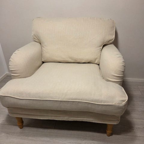 Stocksund nojatuolin Bemz vaalea päällinen. Alle vuoden ollut käytössä. Pesty. Käsinojan suojapäälliset ei ole ollut käytössä. Toinen samanlainen myynnissä omana ilmoituksena.