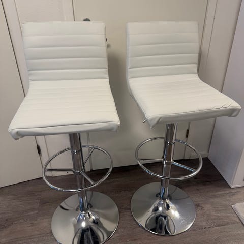 Viininpunaiset baarituolit nahkapäälysteellä. Hyvä kunto ja pinta ehjä. Olleet käytössä pari vuotta ja useamman vuoden varastossa.