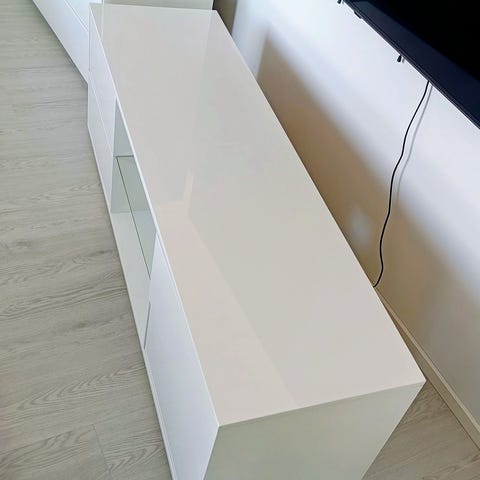 Hyväkuntoinen ja siisti tv-taso jossa lasihylly. Nouto Espoosta.