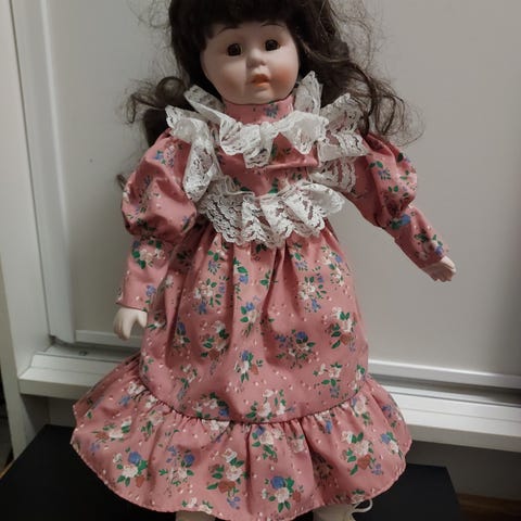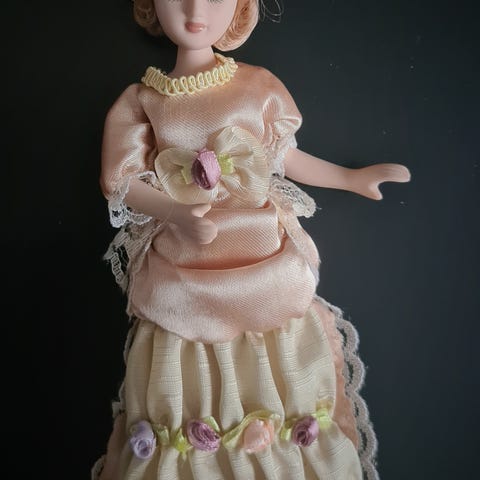 Myydään viehättävä, noin 20 cm korkea posliininukke. Nukella on yllään näyttävä vaaleanpunainen ja valkoinen asu, jossa on runsaasti pitsikerroksia ja kukkakuvioisia nappeja. Kokonaisuuden täydentää hieno lierihattu sulkakoristeella. Erittäin huolitellut yksityiskohdat ja kiharaiset vaaleat hiukset.