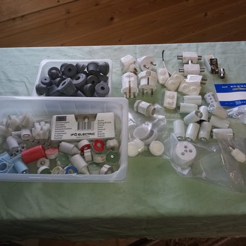 käyttämättömiä sähkötarvikkeita voimavirtapistoke 16A,putken jatkoja,jakorasioita,kotelon kannesta puuttuu ruuvit (valokatkaisimien suojalevyt myyty)kaikki yht.15e