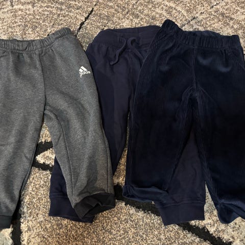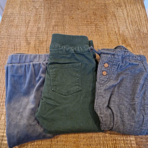 9kpl 86cm housuja, paitsi kettu-housut 86/92cm. Kaikki hyväkuntoisia, mutta siniset muumit ja mustat ylhäällä olevat hieman haalistuneet ja harmaissa dino-housuissa kaksi huomaamatonta pientä tahraa. Homeeton ja eläimetön talous.