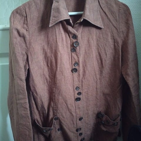 Ruskea takki, jossa nahkaiset yksityiskohdat kauluksessa ja hihoissa sekä kultainen vuori. Joitain nappeja puuttuu/rikkoontunut (katso kuva).