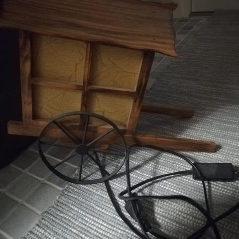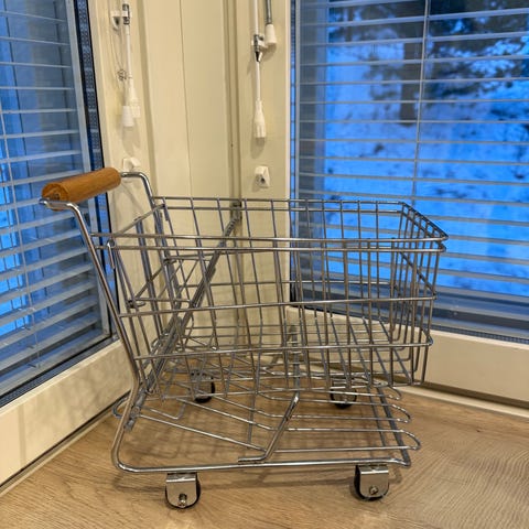 Vintage minikokoinen ostoskärry, valmistettu metallista ja puusta. Kärryssä on neljä pyörää ja puinen työntökahva. Soveltuu esimerkiksi sisustuselementiksi tai pienenä säilytysratkaisuna.