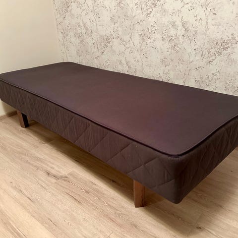 Sänky, koko 120x200 cm, valkoinen kangaspäällyste. Sängyssä on puujalat ja se soveltuu yhden henkilön käyttöön. Kangaspinta on käytössä hieman kulunut ja siinä on pieniä tahrakohtia.