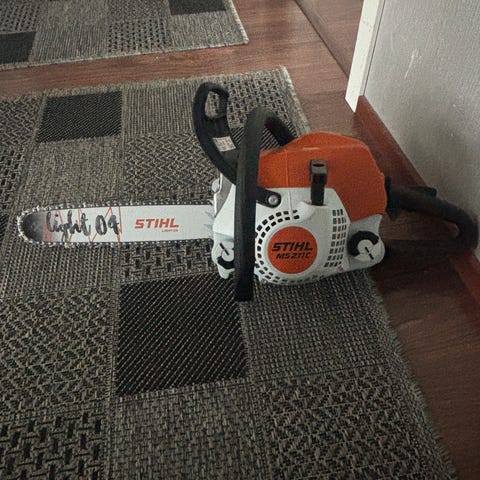 Toimiva Stihl MS 171 moottorisaha, kulumaa havaittavissa. Öljysäiliö tihkuttaa jostain. Suht uusi ketju