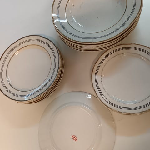 Sarja sisältää 8 teekuppia + 8 tassia (yhdessä kupissa pari säröä). 5 ehjää matalaa ruokalautasta ja 5 ehjää syvää ruokalautasta (molempiin myös kuudennet kappaleet kaupan päälle jotka halunneet ja liimattu). 6 kpl pieniä leipälautasia ja 6 kpl isompia salaatti lautasia. 1 kannu, 1 iso pyöreä matala tarjoilulautanen (halk n.34 cm) ja 1 matala soikea tarjoilulautanen. Leimat suurimmassa osassa näistä kuluneet kokonaan tai vain hyvin vähän näkyvissä enää. Muuten ovat ehjiä mutta tälle sarjalle tyypillisesti yksilöllisiä sävyillä. Perus ilme oikein siisti. Yhteensä 41 osaa + 2 rikkoutunutta kaupan päälle. Hinta yhteensä 200€. En postita, sillä ovat niin painavia sekä hankala pakata särkymättömiksi vaikka kestävää tekoa ovatkin.