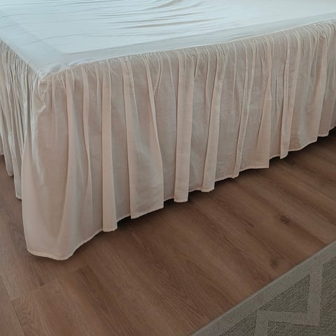 Kerman sävyinen helmalakana 120 cm leveään sänkyyn. Helma kolmella sivulla (pitkät sivut ja jalkopääty). Rypytystä. Helman pituus 45 cm.