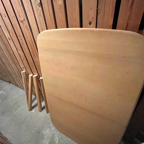 Siisti valkoinen pöytä. Jalat valmiiksi purettu osiin kuljetusta varten.