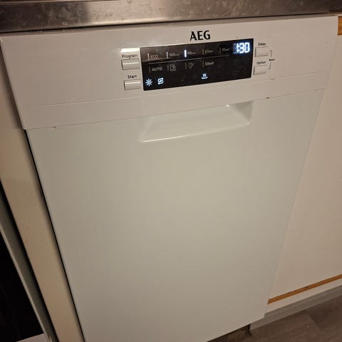AEG astianpesukone, joka on tarkoitettu asennettavaksi tason alle. Laite on väriltään valkoinen ja soveltuu keittiötiloihin, joissa tarvitaan integroitavaa astianpesuratkaisua.