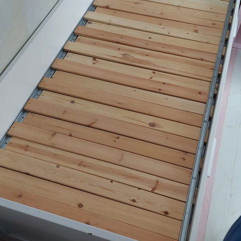 IKEA Brimnes sänky, joka sisältää säilytystilalliset laatikot. Sängyn pystyy levittämään kahdelle hengelle.