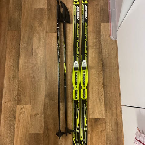 Suksisetti lapselle: Peltosen pitopohjasukset 130 cm nnn-siteellä, Fischerin nnn monot 32 sekä kahdet sauvat 97 +100 cm.