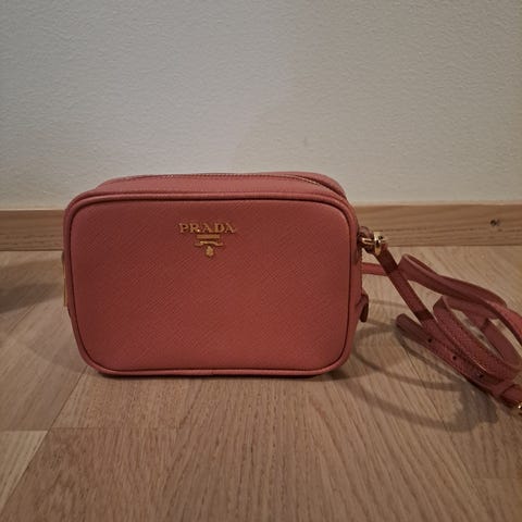 Aito Pradan nahkainen laukku, jossa on vetoketjutasku ulkopuolella molemmin puolin ja sisätiloissa useita taskuja. Mittoja pyydettäessä.