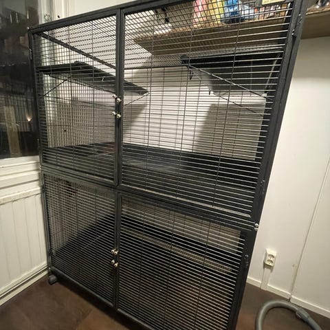 Iso metallinen häkki, jossa kaksi tasoa. Tarjoaa tilavan ja monipuolisen asuinympäristön lemmikille. Mukana paljon tavaraa kuten putkiloita, riippuja, sputnikkeja, kulmavessoja, juomapulloja, herkkuja, kaiveluboxi sekä puolikas pussi toa lätt kuiviketta.