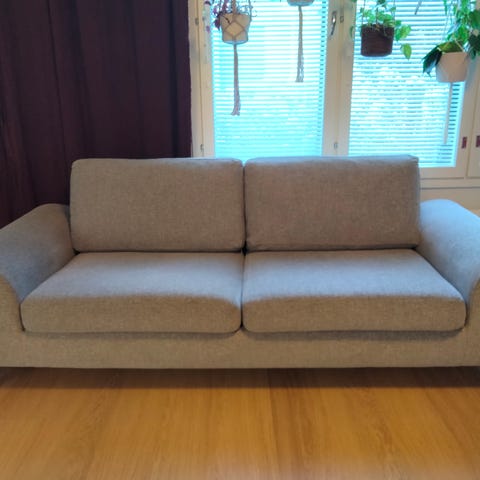 Tarpeettomaksi jäänyt 3 istuttava kuvien mukainen moderni sohva. Ollut suhteellisen vähäisellä käytöllä stailaus käytössä ja toimiston sohvana.