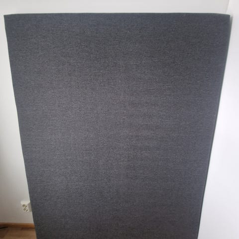 Hyväkuntoinen tummanharmaa sängynpääty joutilaana. Napakka verhoilukangas, ohut pehmuste puolivälistä yläreunaan ja sivuissa.