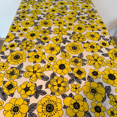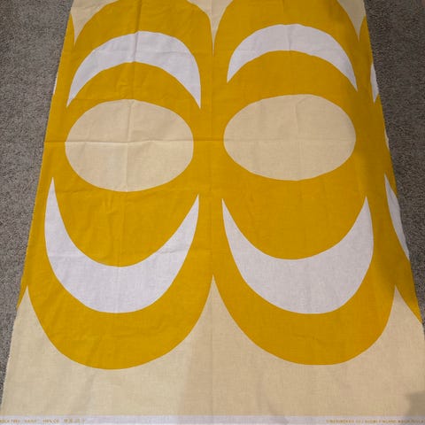 Marimekon keltainen Kaivo-kangas 145x175cm. 100% puuvillaa. Käyttämätön ja pesemätön. Yhdessä kohdassa pieni sininen piste, näkyy viimeisessä kuvassa.