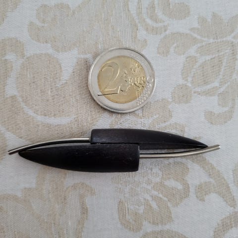 Tyylikäs Aarikan rintaneula, hopeaa. Pituus 63 mm, leveys 16 mm.