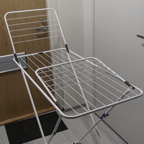 Sturdy foldable clothes drying rack in good condition. Lightweight yet stable, with ample space for drying laundry indoors. Easy to fold flat for storage when not in use. Clean and fully functional.