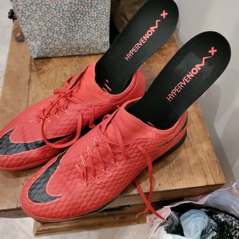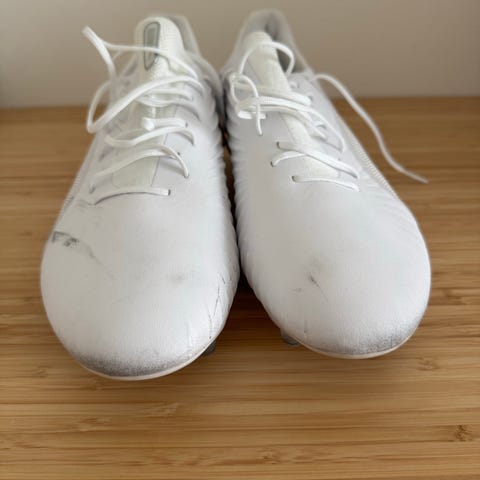 Käyttämättömät Puman jalkapallokengät. Kenkiä on säilytetty lämpimässä varastossa.