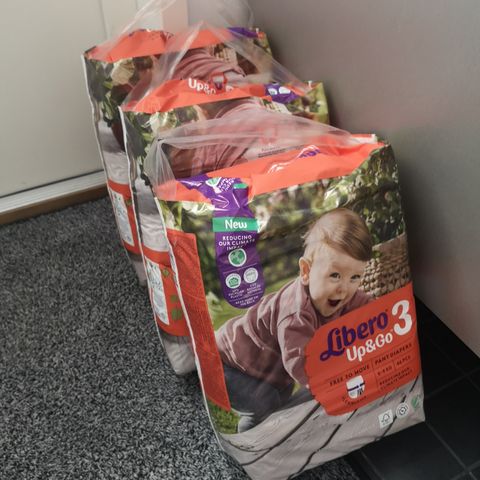 Myyntiin kolme pakettia Liberon Up&Go housuvaippoja. Poika oppikin tosi nopeasti täysin kuivaksi (myös yökuivaksi).