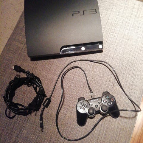 Ps3 + virtajohto. Dualshock 3 ohjain. Latausjohtoa ohjaimeen en lyhyellä etsimisellä löytänyt.