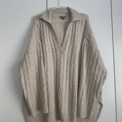 Neulepusero, beige. Tyylikäs napillinen kaulus, jota voi käyttää myös napit kiinni tavallisena poolokauluksena. Koko M, mutta normaalia pienempi, siis pikemminkin koko S.