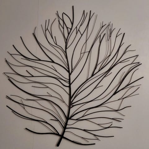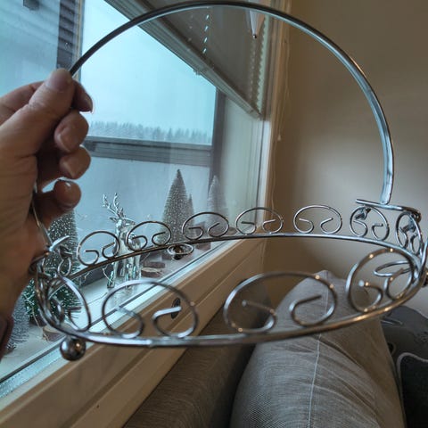 Askon hopenvärinen, metallinen seinäkoriste.