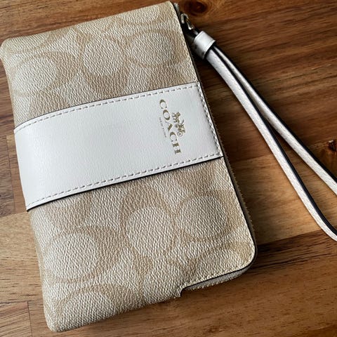 Coach clutch/lompakko/laukku noin 12x19cm. Laukussa on vaalea väriyhdistelmä ja vetoketjusuljenta. Sisältä löytyy korttitaskuja ja tilaa pienille esineille. Laukkua on käytetty, sisällä pieni jälkiä, siisti ja ehjä.