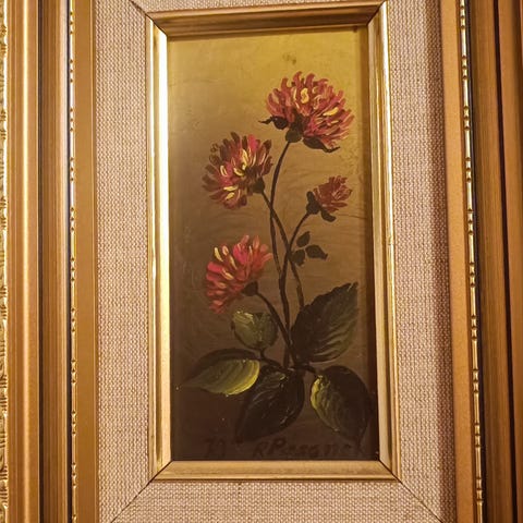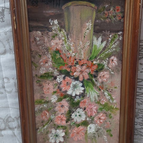 Pieni kukkataulu hopeansävyisillä puukehyksillä.