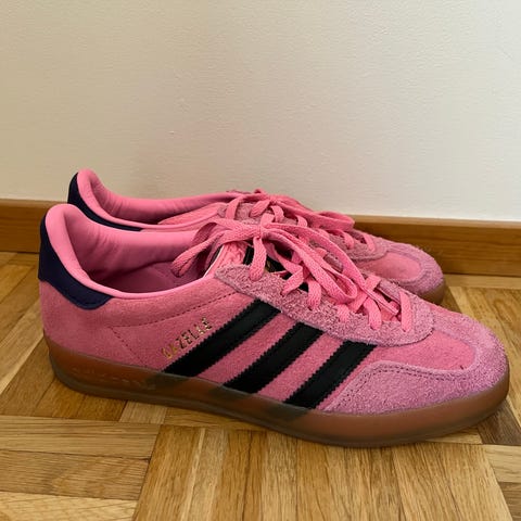 Adidas Gaselle tennarit koko 37 1/3. Väri valkoinen/vaaleanpunainen. Tennarit ovat valmistettu nahkamateriaalista.