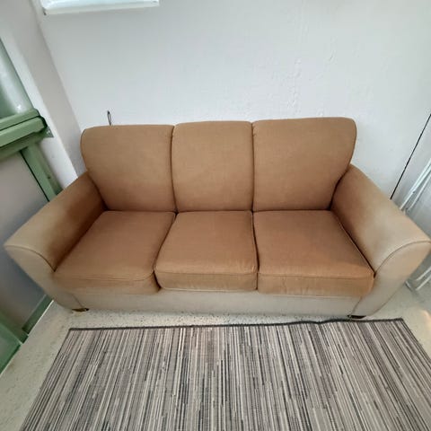 Annetaan 50-luvun vuodesohva. Hyväkuntoinen sohva, mutta päällisessä jonkun verran käytön jälkiä ja nukkaa. Aikoinaan itse verhoiltu.