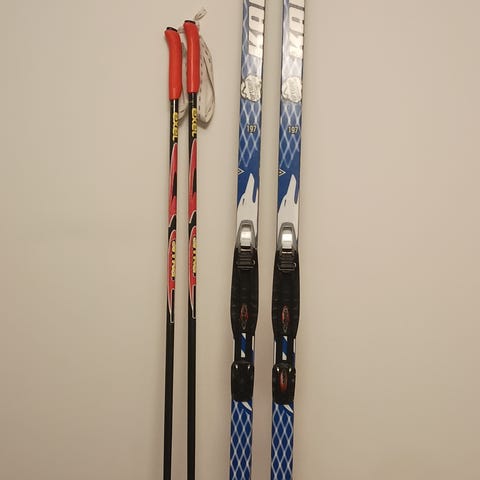 Kaksi kertaa hiihdetyt Karhu sukset ja sauvat. Kunto erinomainen. Optimaaliset noin 170-175 cm hiihtäjälle