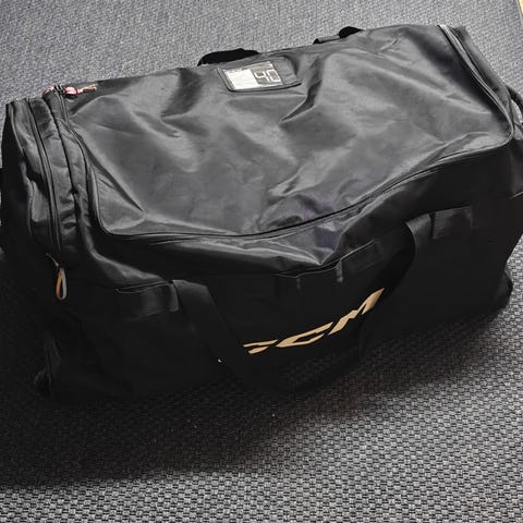 Käyttämätön miesten jääkiekkomaalivahdin kassi CCM EBG WHL 43". Pieni Bluesin logo ja numero 50.