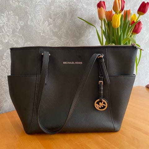Michael Korsin musta jetset laukku läppäritaskulla. Laukussa yhteensä 7 pienempää taskua sisällä. Vetoketju päällä, jolla laukun saa kokonaan kiinni.