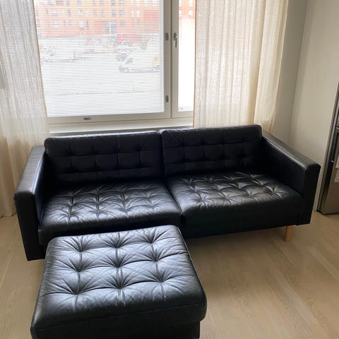 Ikea Landskrona 3:n istuttava sohva puujaloilla.