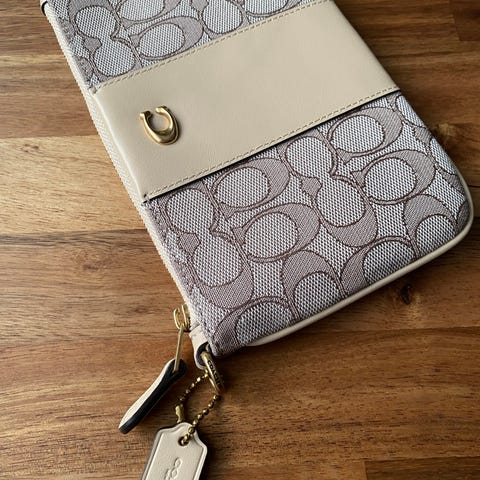 Coach lompakko/laukku/clutch noin 10x15cm. Lompakossa on vetoketju ja sisätiloissa useita korttipaikkoja. Sopii pienten tavaroiden ja korttien säilytykseen. Laukkua on käytetty, siisti ja ehjä.