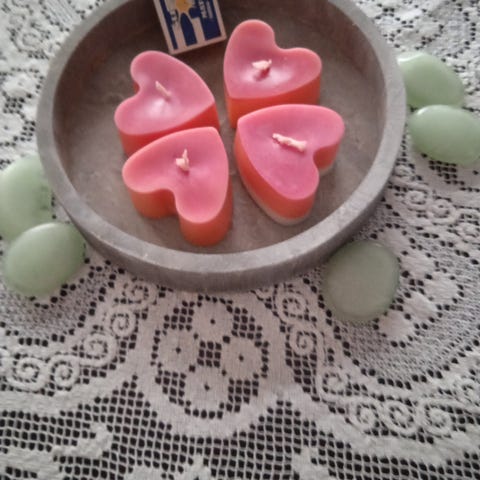 Neljä punaista sydän kynttilää. Ystävälle tai itselle ystävänpäiväksi. Hinta 6€+postikulut.