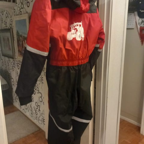 Käytetty mutta ehjä talvihaalari. Juuri pesty. Kulumaa polvissa ja värjäymää keltaisissa osissa.