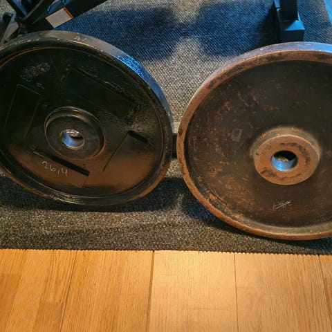 Levytanko ja useita painolevyjä eri painoilla, sopivat kuntosaliharjoitteluun. Levytanko on metallinen ja tarkoitettu painojen kiinnittämiseen harjoittelua varten.