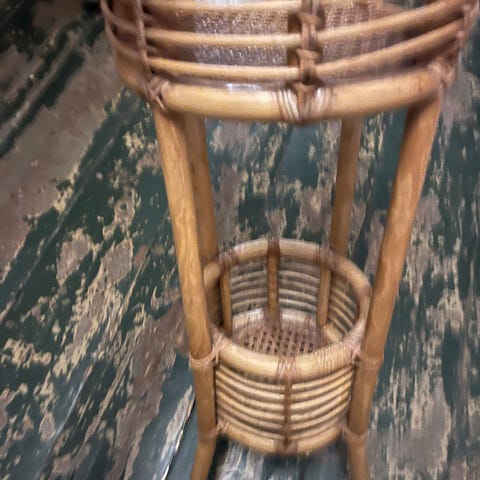 Myydään rottinkinen kukkateline. Ehjä, mutta jonkin verran kulumaa ja tummentumaa on.
