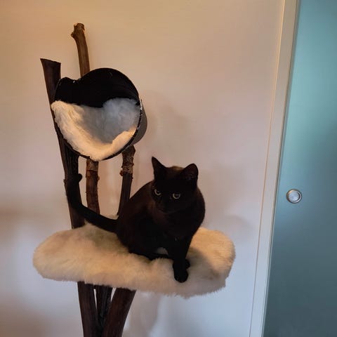 Beigenvärinen kissan raapimapuu, jossa useita tasoja, tikkaat ja kaksi mökkiä.